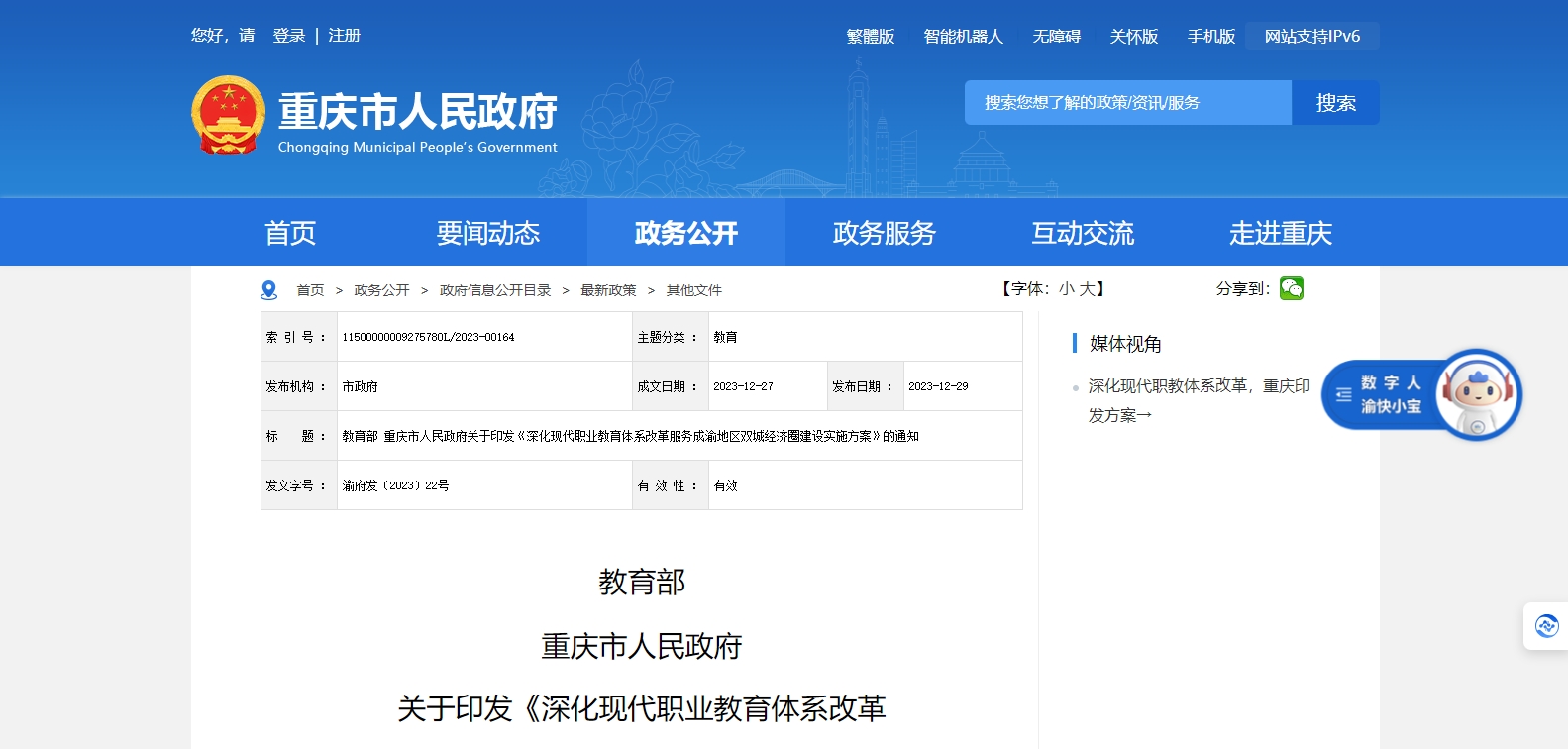 近日,重慶市人民政府官網(wǎng)發(fā)布教育部 重慶市人民政府 關(guān)于印發(fā)《深化現(xiàn)代職業(yè)教育體系改革 服務(wù)成渝地區(qū)雙城經(jīng)濟圈建設(shè)實施方案》的通知,通知中明確實施職業(yè)教育數(shù)字化行動,做大做強重慶智慧教育平臺,建設(shè)國家級職業(yè)教育在線精品課程100門左右、規(guī)劃教材300種左右、專業(yè)教學(xué)資源庫10個左右、虛擬仿真實訓(xùn)基地15個左右。實施教師能力提升行動,教育部支持重慶市承辦全國職業(yè)院校技能大賽教學(xué)能力比賽和德育與思想政治教育有關(guān)賽項,建設(shè)一批“雙師型”教師培養(yǎng)培訓(xùn)基地、教師教學(xué)創(chuàng)新團隊、教師企業(yè)實踐基地和示范性教師企業(yè)實踐流動站,推動企業(yè)工程技術(shù)人員、高技能人才和職業(yè)學(xué)校教師雙向流動。實施終身學(xué)習(xí)質(zhì)量提升行動,推進成渝地區(qū)雙城經(jīng)濟圈學(xué)分銀行建設(shè),開展多種形式的職業(yè)教育資格資歷互認,建設(shè)一批示范性職工培訓(xùn)基地,打造一批職業(yè)學(xué)校老年教育、社區(qū)教育示范基地。