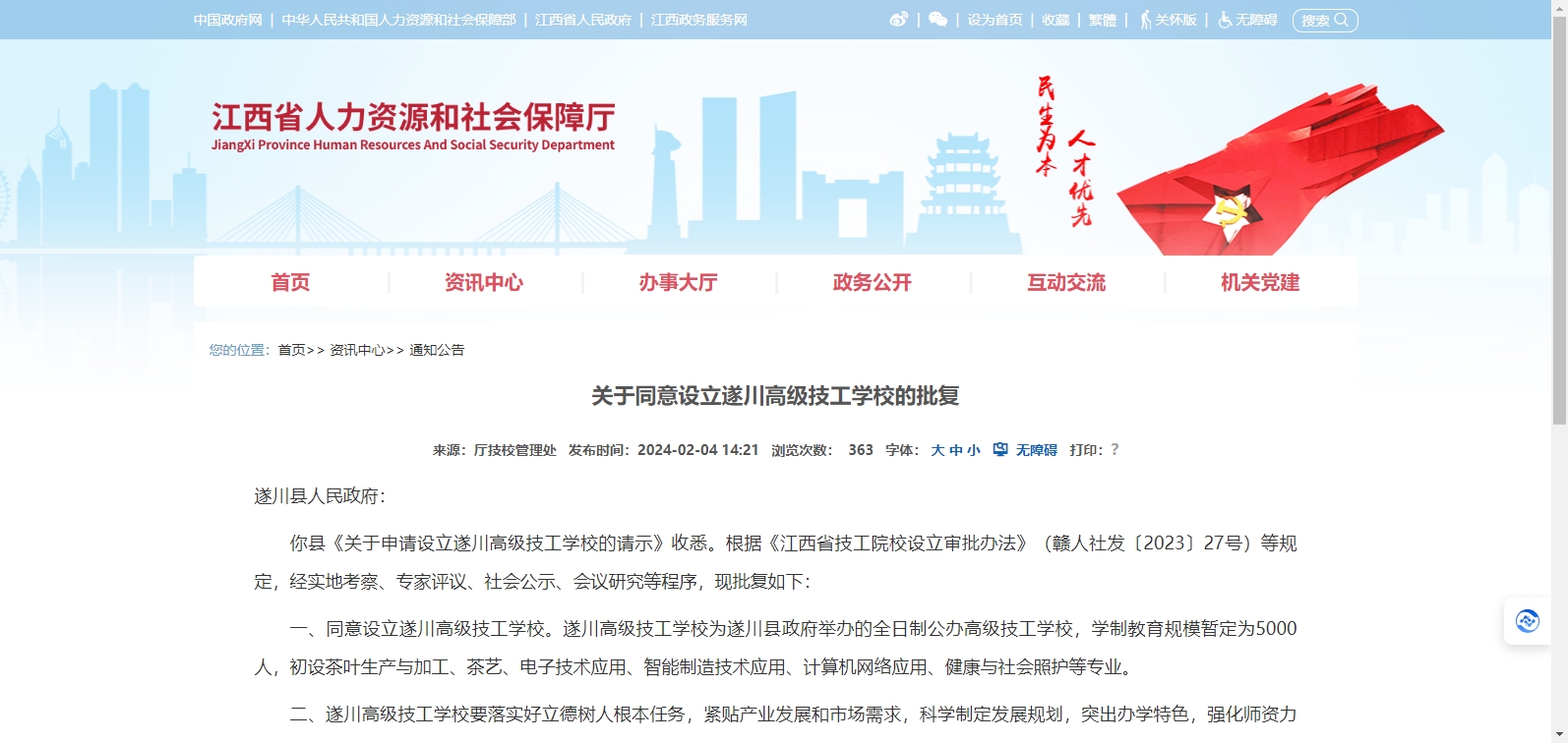 你縣《關于申請設立遂川高級技工學校的請示》收悉。根據(jù)《江西省技工院校設立審批辦法》(贛人社發(fā)〔2023〕27號)等規(guī)定,經(jīng)實地考察、專家評議、社會公示、會議研究等程序,現(xiàn)批復如下: