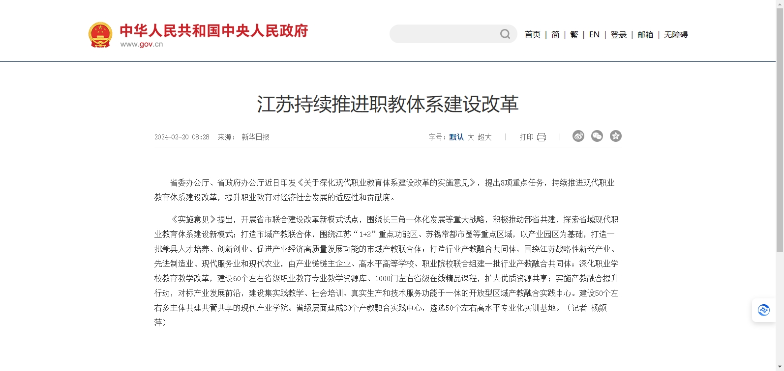江蘇省省委辦公廳、省政府辦公廳近日印發(fā)《關(guān)于深化現(xiàn)代職業(yè)教育體系建設(shè)改革的實施意見》,提出8項重點任務(wù),持續(xù)推進現(xiàn)代職業(yè)教育體系建設(shè)改革,提升職業(yè)教育對經(jīng)濟社會發(fā)展的適應(yīng)性和貢獻度。