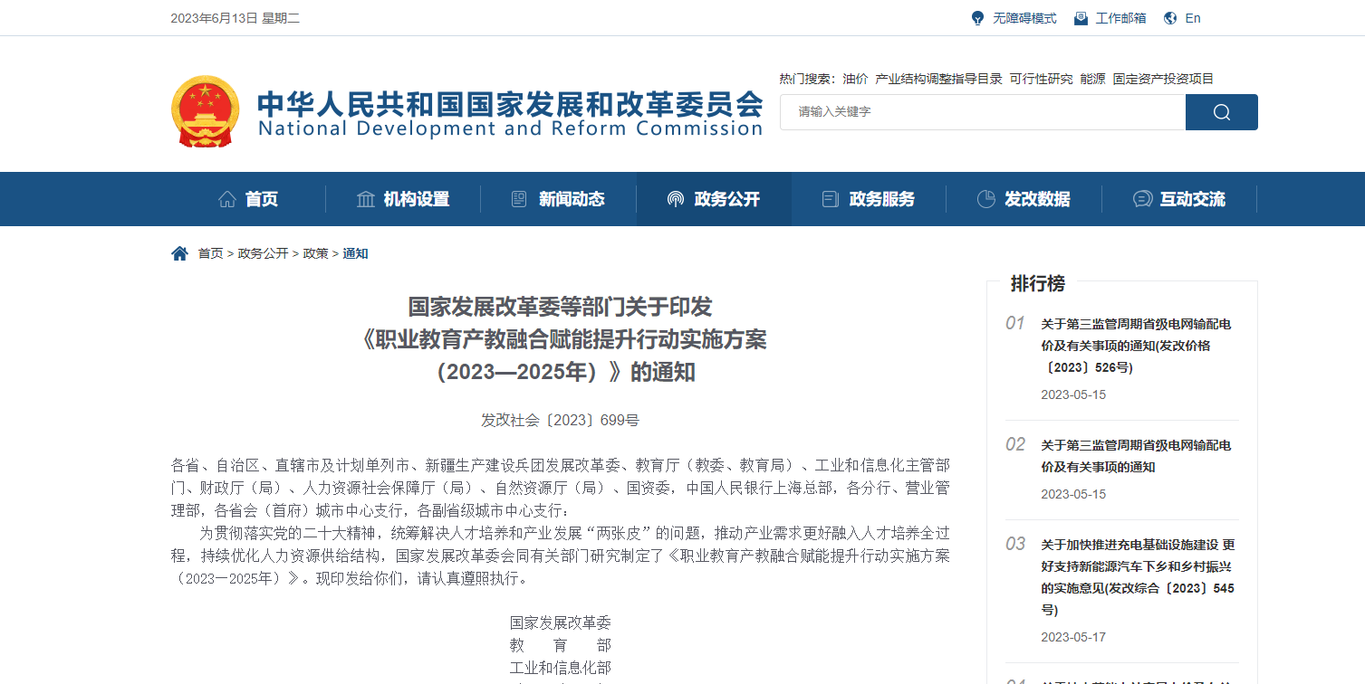 國家發(fā)展改革委等部門印發(fā) 《職業(yè)教育產(chǎn)教融合賦能提升行動實(shí)施方案 (2023—2025年)》的通知