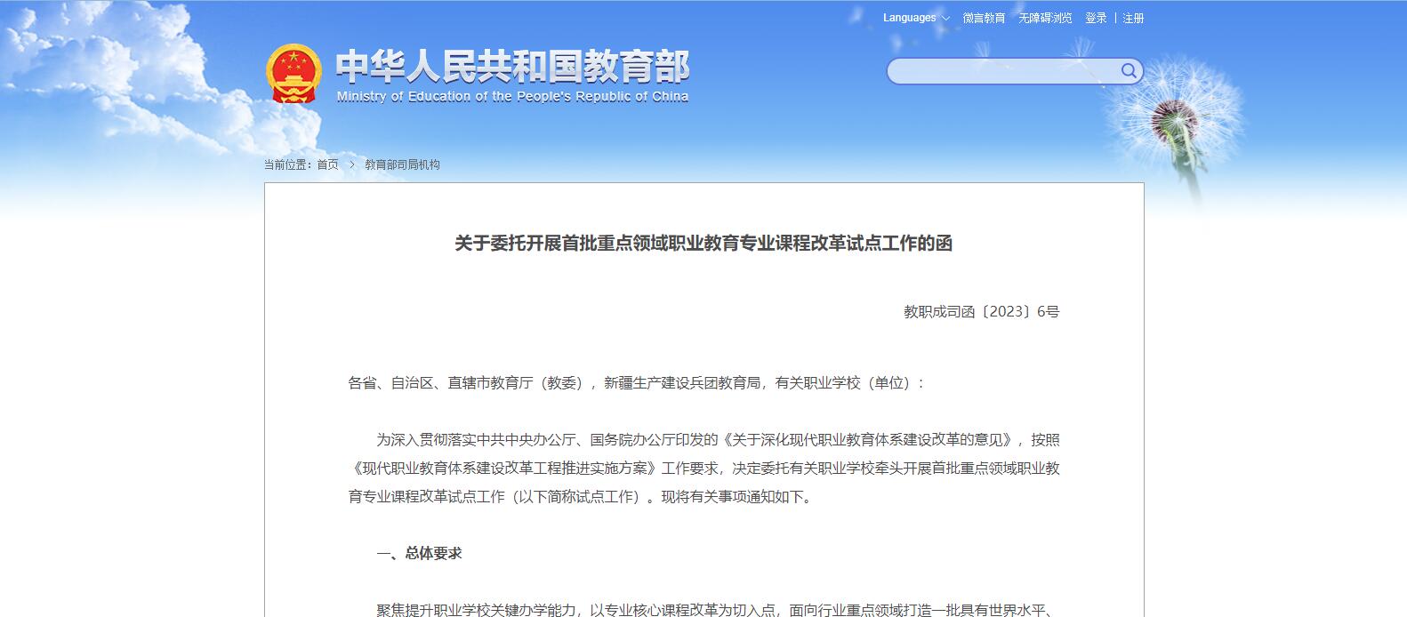教育部職成司發(fā)布關(guān)于委托開(kāi)展首批重點(diǎn)領(lǐng)域職業(yè)教育專(zhuān)業(yè)課程改革試點(diǎn)工作的函