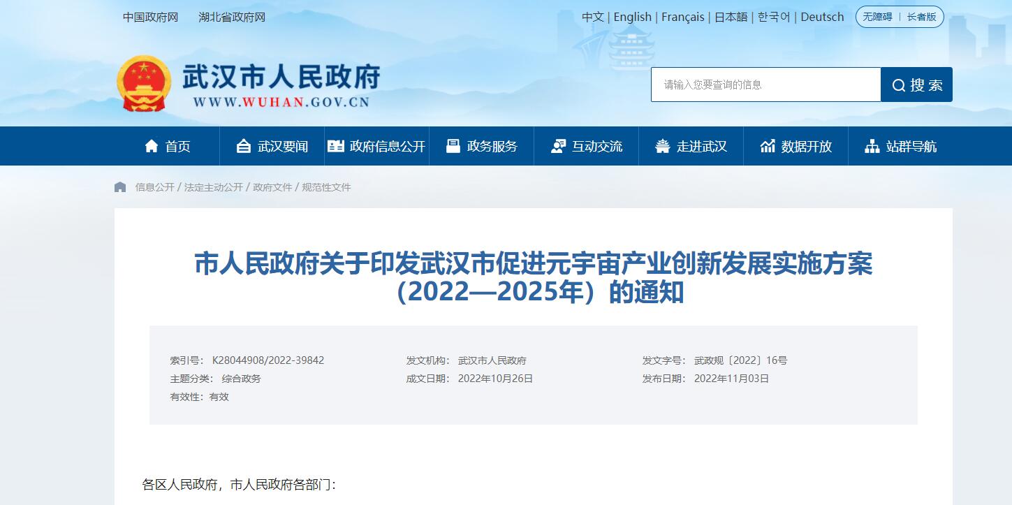 各區(qū)人民政府,市人民政府各部門: 經(jīng)研究,現(xiàn)將《武漢市促進元宇宙產(chǎn)業(yè)創(chuàng)新發(fā)展實施方案(2022—2025年)》印發(fā)給你們,請認真組織落實。 武漢市人民政府 2022......