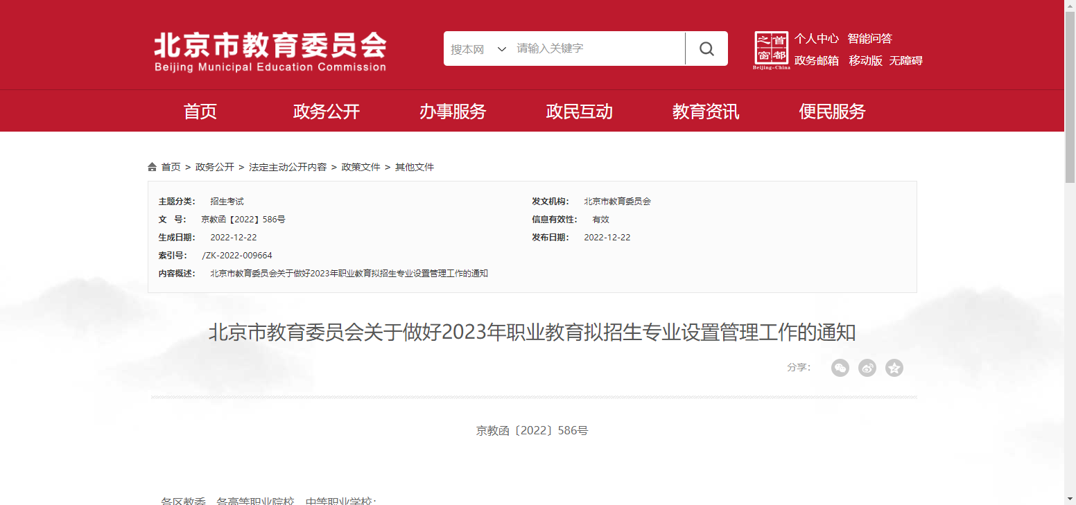 北京市教委發(fā)布《關(guān)于做好2023年職業(yè)教育擬招生專業(yè)設(shè)置管理工作的通知》