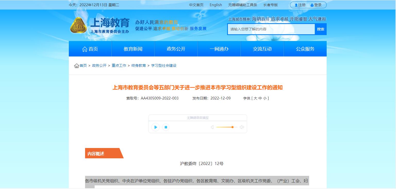 近日,上海市教育委員會等五部門發(fā)布《關于進一步推進本市學習型組織建設工作的通知》,明確將整合各類終身教育優(yōu)質資源,在線提供精準推薦和預約配送,鼓勵各類學習型組織發(fā)揮自身優(yōu)勢建設學習資源,形成資源的共建......