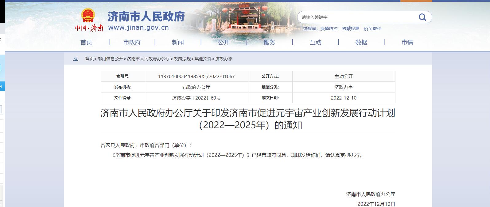 濟南市政府12月10日發(fā)布《濟南市促進元宇宙產業(yè)創(chuàng)新發(fā)展行動計劃(2022—2025年)》。山東省濟南市政府12月10日發(fā)布《濟南市促進元宇宙產業(yè)創(chuàng)新發(fā)展行動計劃(2022—2025年)》(以下簡稱《......